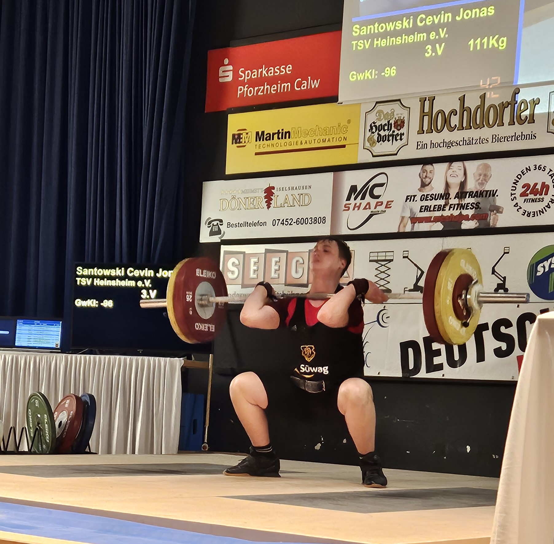 Und irgendwie hatte es der TSV bei dieser Meisterschaft mit den vierten Plätzen. Als letzter ins Medaillenrennen stieg Cevin Santowski ein. In der Gewichtsklasse bis 96 kg hob auch er bravourös auf. 3 gültige Versuche und die noch nie im Reißen bewältigten 93 kg waren ein Einstand nach Maß. Trotzdem befand sich auch er nach dieser Teildisziplin auf Rang 4. Auch er versuchte mit aller Macht noch den Sprung aufs Podium zu schaffen. Gültigen 98 kg, folgten 103 kg im Stoßen. Um Bronze zu gewinnen, benötigte er nun einen bewältigten Versuch an 111 kg. Und er bewies sein Kämpferherz. Tatsächlich legte er die auflegte Last noch um und scheiterte nur denkbar knapp im Ausstoß, womit auch für ihn Platz 4 besiegelt war.